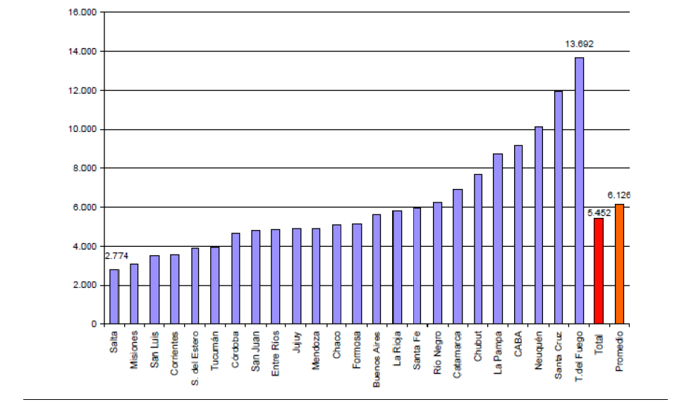 Les inégalités régionales en matière de condition socioéconomique sont évidentes lorsqu’on analyse les PGB par habitant, en particulier, du nord-ouest et nord-est argentin, qui révèlent que dans ces régions les niveaux sont entre 50/55 % inférieurs au PIB par habitant du pays. A l’inverse, au sud, la rareté de la population contribue, en partie, à ce que le PGB soit 40 % supérieur au niveau par habitant national…(59)