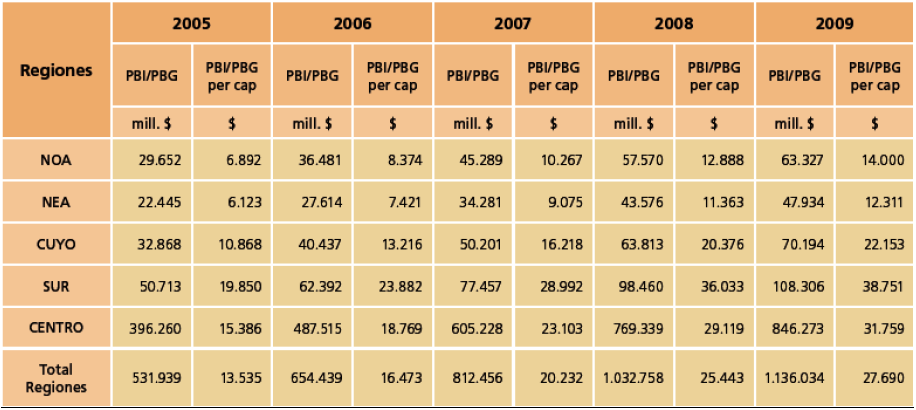 Ci-dessous, nous reprenons un tableau paru en 2010 dans une publication du DINIECE (Direction Nationale d’Information et d’Evaluation de la qualité éducative), qui montre les différences de PIB/PGB total et par habitant en fonction des régions en Argentine de 2005 à 2009.(57)