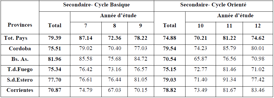 Par contre, l’enseignement secondaire connaît de manière générale une baisse des taux, surtout au niveau des trois dernières années (polymodal) et également des disparités importantes en fonction des provinces : les provinces du nord présentent les taux les plus bas tandis qu’on trouve à Buenos Aires et Tierra del Fuego, situées respectivement au centre et au sud de l’Argentine, les taux les plus élevés. Cordoba, elle présente des taux moyens entre ces deux extrêmes.