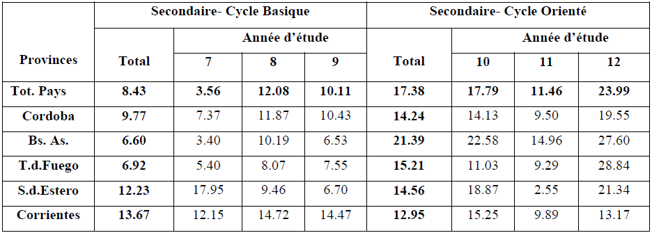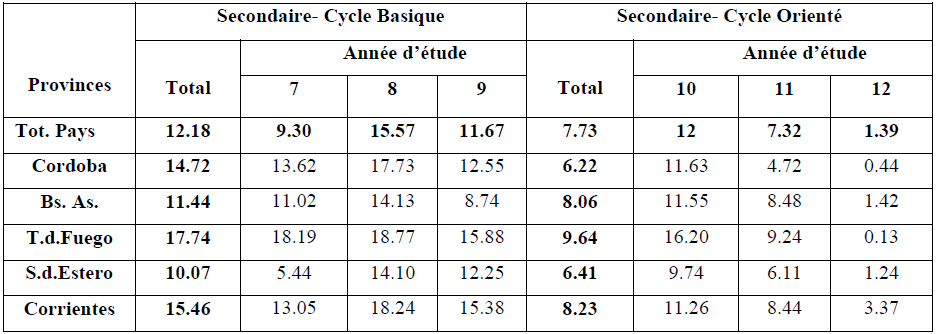 Au niveau du premier cycle, c’est la 8e année d’étude qui est la plus critique en la matière avec un taux de 12.08 % (sauf dans le cas de Santiago del Estero où le problème se pose davantage pendant la 7e année avec 17.95 %).