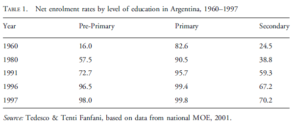 A côté des disparités géographiques, Barbeito et Goldberg relèvent aussi l’existence de disparités sociales au sein des provinces : il existe un écart important entre les pauvres et ceux qui ne le sont pas, non pas tellement en matière d’accès à l’enseignement mais dans leur capacité à compléter les différents cycles, particulièrement dans le secondaire.(79)