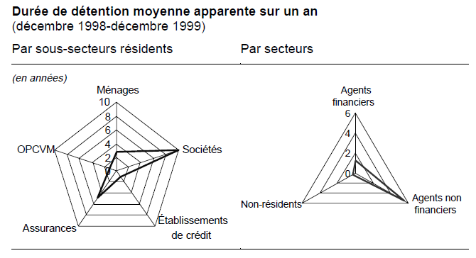 Le schéma ci-dessus est issu d’une étude de la banque de France sur la durée de détention des actions françaises selon le type d’acteurs. Il est intéressant de noter que ce sont les OPCVM (organisme de placement collectif en valeurs mobilières) qui ont la durée de détention la plus courte (1 an et 1 mois). Or les OPCVM sont les outils de base de la gestion collective pour les sociétés de gestion, ils comprennent les FCP (fonds communs de placement). Le second schéma corrobore cette observation puisque les agents non financiers détiennent des actions environ six ans tandis que les agents financiers gardent leurs actions moins de deux ans, soit un rapport de plus de trois.