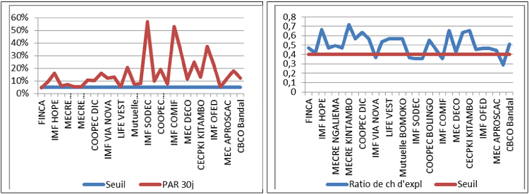 Pour ce qui est du portefeuille à risque, pratiquement toutes les institutions ont affiché un PAR 30 de plus de 5% (15,9% de moyenne). Pareille pour le ratio de charge d’exploitation qui est restée supérieur à 40% pendant la période d’étude (49,9% de moyenne). Néanmoins, le PAR30 minimal est de 4,3 et le ratio de charge d’exploitation de 28,9%.