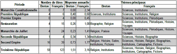 La période la plus prolifique pour l’édition brestoise, toute langue confondue, est la Troisième République, avec une moyenne de 4,67 titres par an. Vient ensuite, pour le breton, le Second Empire (0,73 titre en moyenne). Pour le français, la période révolutionnaire, avec une moyenne annuelle de 2,34 titres, représente une grande part de la production. Ceci s’explique par le fait que les textes de lois et décrets que l’Assemblée Nationale faisait paraître étaient édités de façon systématique.