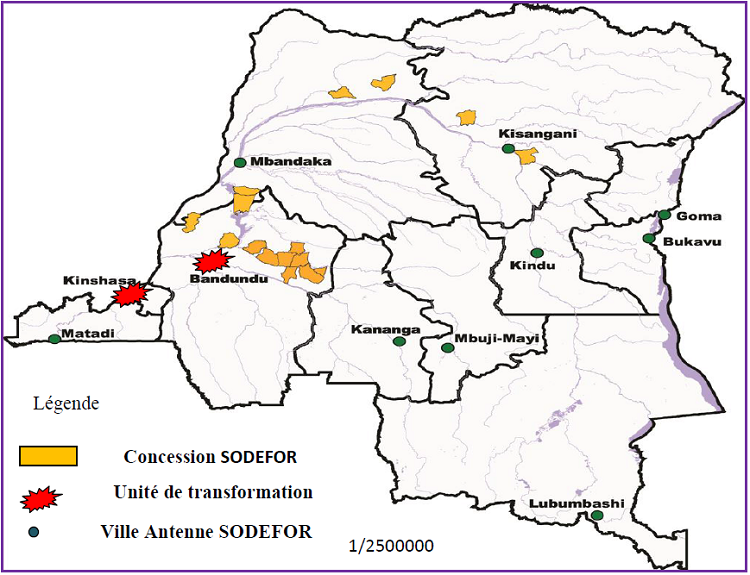 La SODEFOR dispose à ces jours de deux importantes unités de transformation : une à Nioki au Bandundu et une autre à Kinshasa où ce travail a été effectué. Elle est détentrice de 16 concessions forestières totalisant 2 139 350 hectares dont 1 807 395 hectares utiles (avant aménagement). La figure 1 présente la localisation des sites SODEFOR en RDC.