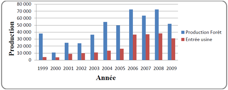 La SODEFOR est en train de fournir un effort considérable pour augmenter sa transformation locale. La figure 2 montre l’évolution de la production forêt et la part entrée à l’usinage.
