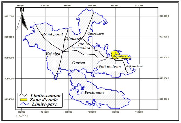 Notre étude a été réalisée au niveau du canton Pépinière qui s’étend sur une superficie de 82 ha. Ce canton est limité au Nord par la ville de Theniet El Had, à l’Ouest par le canton Gueroauou, au Sud par le canton Sidi Abdoun, et à l’Est par le canton Kaf Sachine.