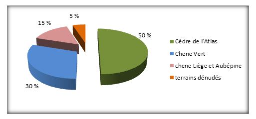 D’après la figure 5.4, on peut dire que le canton Pépinière est recouvert par les formations forestières du Cèdre de l’Atlas, Chêne vert, Chêne liège et l’Aubépine. La formation forestière dominante est celle du Cèdre de l’Atlas qui occupe presque la moitié de la surface du canton, et vient en deuxième lieu le Chêne vert avec environ 30% de la surface, le Chêne liège et l’Aubépine couvrent presque 15 % et la surface restante présente des terrains dénudés (formations rocheuses, clairières, routes).
