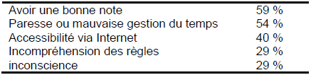 Ainsi Dordoy (2002) trouvent que les raisons les plus communes incitant les étudiants à recourir au plagiat électronique sont liées soit aux notes, soit à la mauvaise gestion du temps, ou soit à l’opportunisme. Les raisons qui lui ont été le plus citées par les étudiants sont :