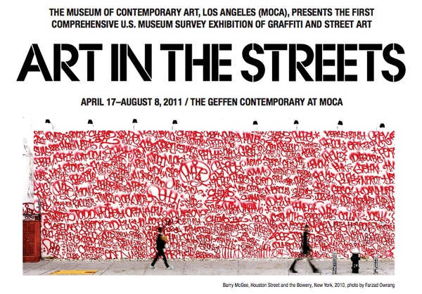 Le curateur d’Art in the Streets, Jeffrey Deitch, est actif dans le street art depuis plusieurs années, en tant que critique et galeriste. Par cette exposition, il veut à la fois raconter l’histoire de l’art de rue, avec ses pionniers légendaires, ses œuvres mythiques, ses influences incontournables, et le montrer comme un mouvement vivant et mature, varié et cohérent, surtout dans la qualité des réalisations. Voici sa déclaration dans le communiqué de presse annonçant l’exposition : « Art in the Streets sera la première exposition à situer le travail des artistes de rue les plus importants dans le contexte de l’art contemporain (16).» Il faut ici préciser que les artistes sélectionnés par Deitch représentent davantage le graffiti américain que le street art, avec une surreprésentation masculine et une influence marquée de la culture hip-hop : il s’agit plutôt là de l’artification d’un mouvement populaire – que même ses adeptes sont loin de s’accorder à reconnaître comme art – que d’une véritable tentative d’explorer la richesse de l’art dans la rue.