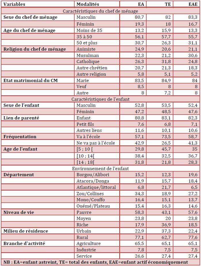 Le tableau nous permet également de faire une comparaison des profils des enfants astreints à la répartition dans la population totale et dans la population des enfants économiquement actifs en ce qui concerne l’environnement familial et les caractéristiques du chef de ménage.