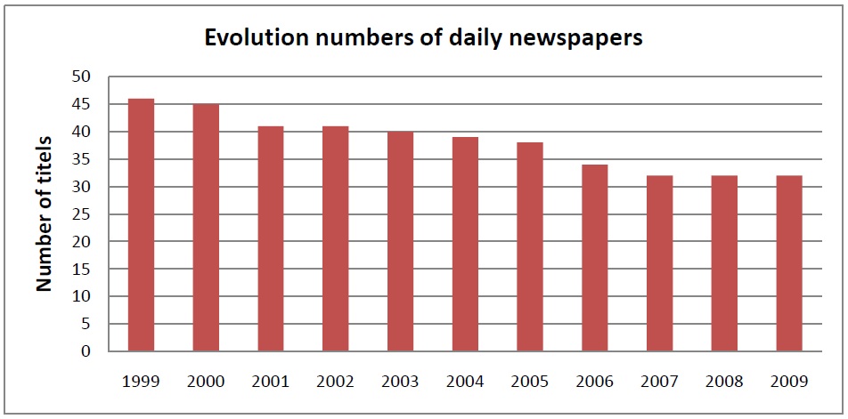 Another easy way to look at the changes brought by the Internet can be done by comparing the offer of newspapers and online offer in the last few years. Below it is the evolution of the total amount of daily newspapers in Switzerland (published at least four times a week):