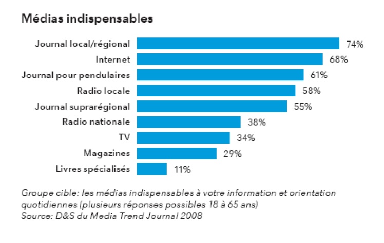 A different facet that illustrates the changes due to Internet is that the Web has become a huge factor in the media landscape of Switzerland. Many people consider that it is an essential media to them. The graphic below shows that today it is almost as indispensable as local newspapers: