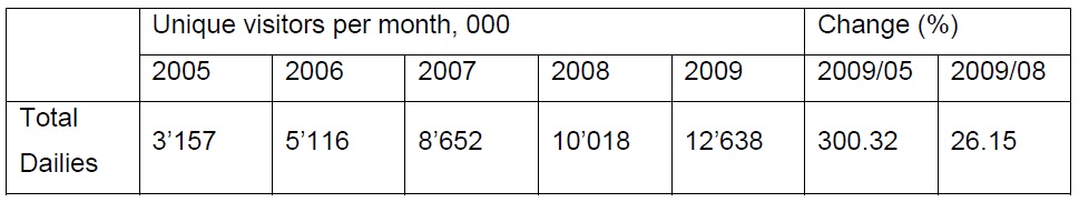 Clearly there is a huge raise in online readership; the number is particularly impressive from 2005 to 2009, as it was an increase of 300%.