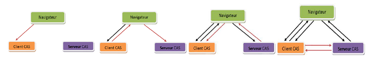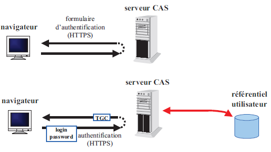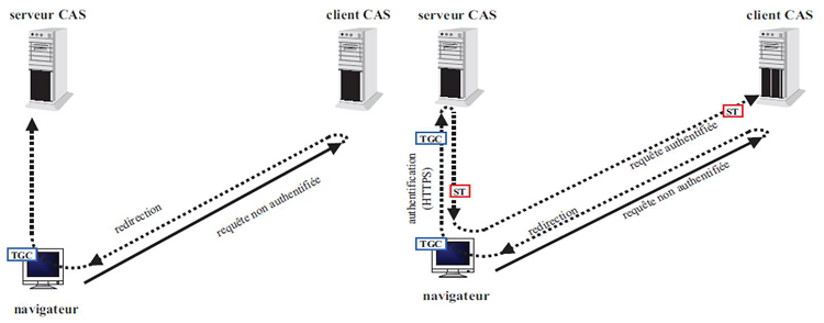 Lors de l’accès à une ressource protégée par un client CAS, celui-ci redirige le navigateur vers le serveur CAS dans le but d’authentifier l’utilisateur (le navigateur), précédemment authentifié auprès du serveur CAS et lui présente le TGC.