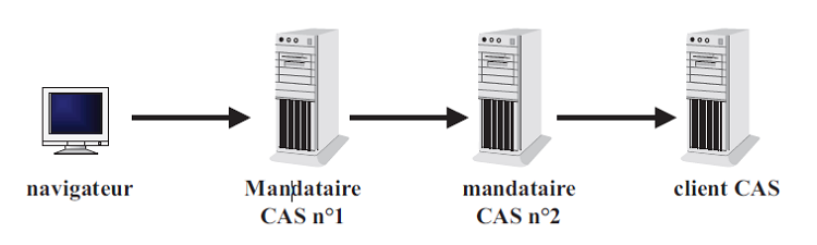 Dans le fonctionnement de base, le client CAS est toujours en lien direct avec le navigateur. Dans un fonctionnement n-tiers, le navigateur accède à un client CAS à travers un mandataire CAS. Le mécanisme de redirection vu dans le fonctionnement de base n’est alors plus applicable.