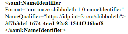 Cet identifiant est opaque, c’est-à-dire qu’il ne contient pas d’information personnelle concernant l’utilisateur. Il n’est utilisé que dans le cadre des échanges entre les différentes briques de Shibboleth, et n’est connu ni de la ressource accédée ni du SI de l’établissement. Un exemple de nameIdentifier est montré ci-dessous.