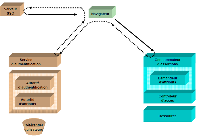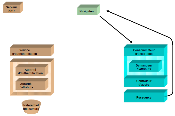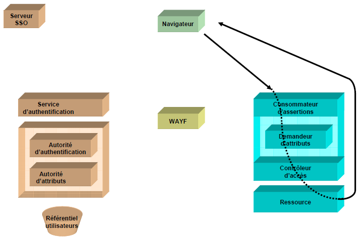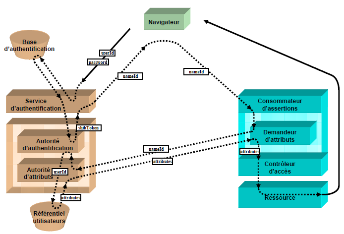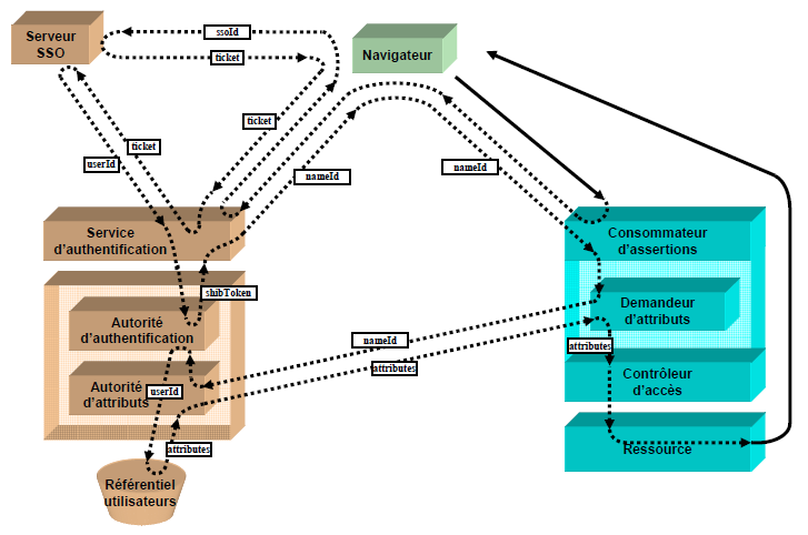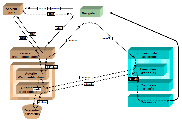 L’objectif est de montrer les interactions entre les acteurs du système qui permettent la délégation de l’authentification et la propagation des attributs utilisateurs. Afin de mieux appréhender un fonctionnement globalement complexe, nous présentons d’abord les acteurs du système, puis détaillons les interactions entre les acteurs du système lors de l’accès par un navigateur à une ressource web.