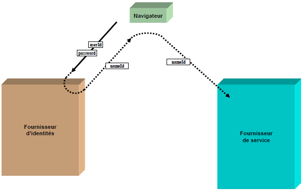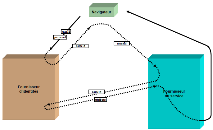 C’est cet identifiant opaque qui va permettre au SP de récupérer les attributs de l’utilisateur auprès de l’IdP. Ces attributs de l’utilisateur sont transmis au SP par l’IdP, via l’appel d’un Web Service, l’échange du nameIdentifier.