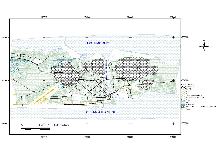 Sur le plan hydrologique, l’Océan Atlantique, le lac Nokoué, les lagunes Djonou et Todouba, et les dépressions à hydromorphie temporaire ou permanente constituent les importants plans d’eau qui influencent les activités humaines dans la zone d’étude. Les principaux tributaires du lac Nokoué sont les fleuves Ouémé, Sô et la lagune Djonou. Les rivières Todouba, Dati et Ahouhangan sont à leurs tours tributaires de la lagune Djonou. Le lac Nokoué communique à la mer par le chenal de Cotonou (lagune de Cotonou) qui sépare les étendues Est et Ouest de la ville. Par ailleurs, il existe dans ses environs, un système de lagons et de bas-fonds avec lesquels il était à l’origine en communication, mais qui sont actuellement isolés par l’urbanisation de la ville. Les fluctuations de niveaux des lagunes sont en rapport non seulement avec la pluie, mais aussi avec l’hydrodynamique de la nappe superficielle, celles- ci étant en continuité hydraulique avec elles.