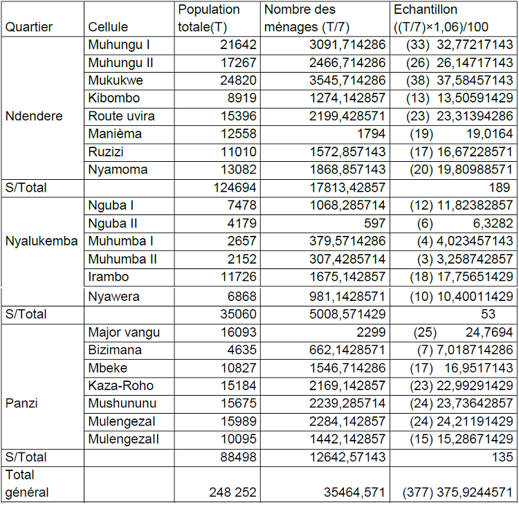 La formule ci-haut avait été utilisée dans la recherche de l’échantillon dans chaque entité administrative de la commune d’Ibanda. L’application de la dite formule avait donné les résultats décimaux comme présenté dans le tableau 10. En effet, comme il ne pourrait pas exister des demi-ménages, nous étions obligés d’arrondir à l’unité le résultat obtenu dans chaque cas avant de calculer leur somme qui s’est élevée à 377 ménages au lieu de 375,9244571 ménages proposées par le tableau.