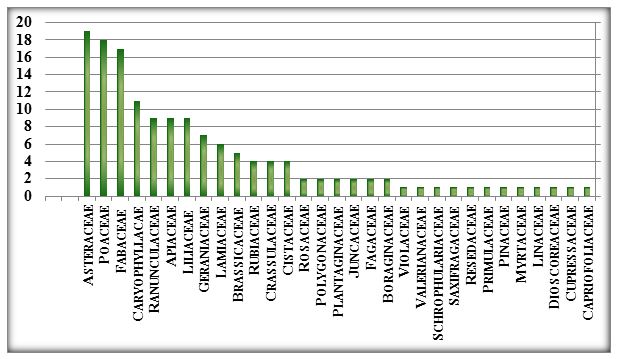 D’après le diagramme, on déduit que les familles des Asteraceae, Poaceae et Fabaceae sont plus présentes avec un nombre de 19, 18 et 17 respectivement, viennent en second lieu les Caryophyllaceae (11 espèces) , Ranunculaceae, Apiaceae et Liliaceae avec 09 espèces, ensuite viennent Geraniaceae et Lamiaceae 07et 06 espèces respectivement , alors que le reste des familles recensées sont présentes avec un chiffre variant entre 01 et 05 espèces (Capriofoliaceae, Cupressaceae, Dioscoreaceae, Linaceae, Myrtaceae, Pinaceae, Primulaceae, Resedaceae, Saxifragaceae, Schrophulariaceae, Valerianaceae, Violaceae, Boraginaceae, Fagaceae, Juncaceae, Plantaginaceae, Polygonaceae, Rosaceae, Cistaceae, Crassulaceae, Rubiaceae, Brassicaceae).