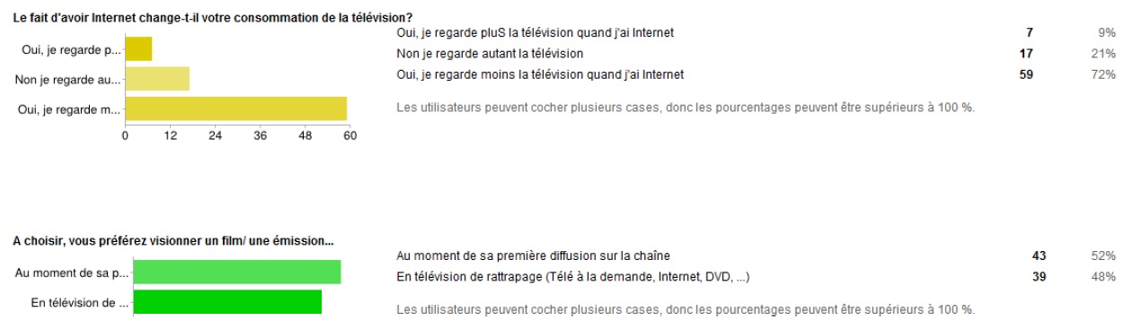Les réponses à la quatrième question nous permettront de traiter l’impact de la télévision connectée sur le modèle actuel des chaînes généralistes car une tendance se démarque de façon importante (presque trois quarts des sondés affirment qu’ils regardent moins la télévision quand ils ont une connexion Internet à portée).