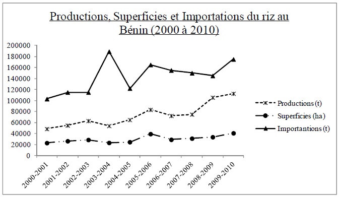 Figure 2.6 : Productions, Superficies et Importations du riz au Bénin (2000 à 2010) au cours
