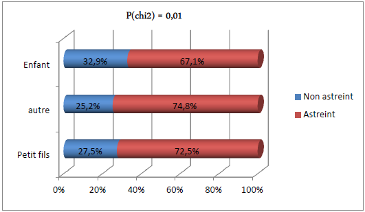 Avec une marge d’erreur de 5%, le lien de parenté est significativement relié à l’astreinte aux travaux dangereux. Les autres liens (enfant en garde, adopté du conjoint, etc.) présentent la plus forte fréquence (74,8%) d’enfants astreints. Nous avons ensuite les petits fils (72,5%). Ces chiffres viennent confirmer les résultats antérieurs de la revue de littérature obtenus par Vignikin (2003) dans le statut de l’enfant dans le ménage. La régression viendra les confirmer ou les infirmer.
