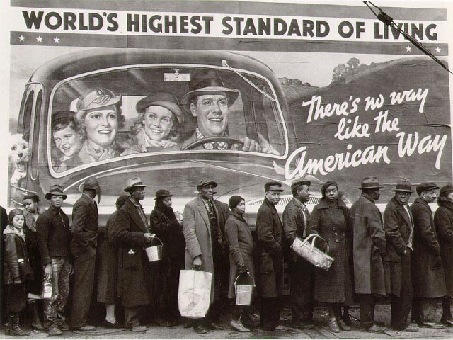 L’art, censé être désintéressé, et la publicité, expression d’intérêts et création de désirs, sont-ils antinomiques ? Comment l’art réagit-il ou interagit-il avec la publicité ? La publicité s’inspire de l’art, des artistes collaborent à des campagnes promotionnelles, et l’art, par un mouvement circulaire, se nourrit également de la publicité. Les réactions négatives, actions « anti-pub » qui peuvent aller du simple graffiti au détournement sophistiqué, ne sont pas un phénomène nouveau : après la crise de 1929, les affiches publicitaires, perçues comme la face publique d’un système désastreux, furent prises d’assaut par des citoyens excédés, encouragés par le magazine Ballyhoo à joindre l’école des « retoucheurs » (toucher uppers). Ces affiches vantant les mérites de produits superflus ou hors d’atteinte pour les populations touchées par la crise économique semblent en effet bien cruelles lorsqu’elles sont replacées dans leur contexte, comme dans la photographie de Margaret Bourke-White, At the time of the Louisville flood [3. Margaret Bourke-White, At the time of the Louisville flood, photographie, 1937], collage social mêlant rêve américain et cauchemar du quotidien (34).