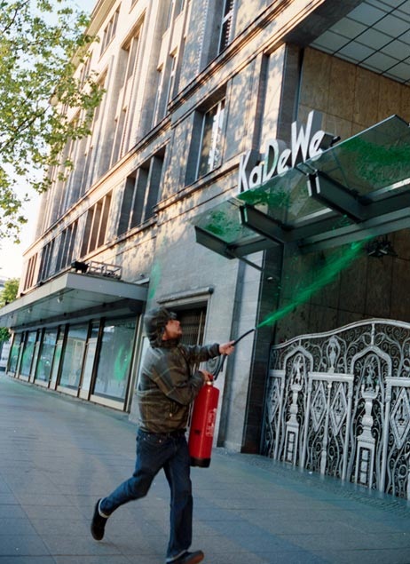 Blu ne pensait sans doute pas que son œuvre était si provocante qu’elle serait immédiatement effacée sans débat ; après tout, le curateur était sans doute familier avec le reste de son travail et lui avait donné carte blanche pour créer une image représentative de l’art de la rue. D’autres artistes prennent les devants de la censure et interprètent autrement la relation avec leur commanditaire. En 2008, pour les 75 ans de la marque Lacoste, Brad Downey fut invité à réaliser une œuvre de son choix pour décorer la vitrine d’une boutique berlinoise. Il proposa une performance, qui serait filmée et montrée en vidéo, sans en donner les détails. Prenant à la lettre son rôle de décorateur de vitrine, l’artiste décida de projeter de la peinture verte, de la teinte exacte du crocodile Lacoste, sur toute la façade du centre commercial, à l’aide d’un extincteur modifié. La presse locale cria au vandalisme et soupçonna des activistes anticapitalistes ; la marque « décommanda » l’artiste et nettoya la façade « marquée » par l’artiste à ses propres couleurs. L’explication de l’artiste ? « Si vous employez un vandale, c’est un vandale que vous aurez (21)».