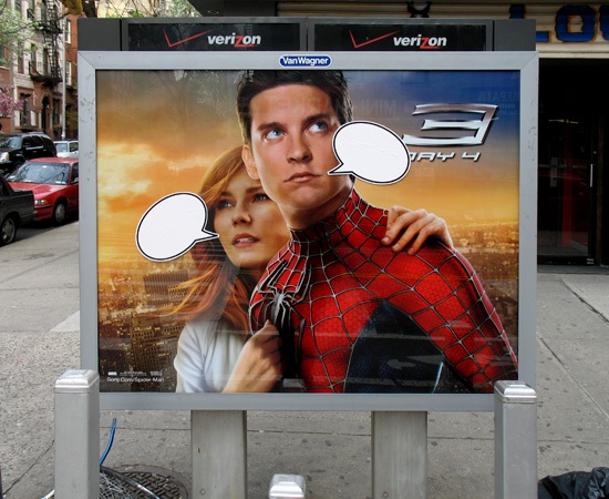 L’art de rue se doit donc d’être efficace sans toutefois être aussi simple qu’un mot d’ordre publicitaire ou partisan : il s’agit d’offrir prise à une interprétation personnelle et ouverte. La publicité, pour Tom Tom, « est une belle machine d’uniformisation, de nivellement, entre autre de la langue (41)» ; l’art de rue, surtout dans son incarnation textuelle, s’occupe donc de brouiller les cartes et d’activer le langage. Des tags qui ne veulent rien dire aux aphorismes de Miss.Tic, des jeux de mots faciles des détournements de logos (Shell/Hell) aux Truisms de Jenny Holzer, des affiches aux échos soixante-huitards aux fausses bonnes nouvelles du New York Times des Yes Men, le langage du street art a une dimension d’imaginaire et de rêve – et parfois de cauchemar – que la publicité ne peut qu’imiter grossièrement. L’art de rue peut même se donner le luxe d’être une page blanche, comme les bulles vides de Ji Lee apposées sur des affiches publicitaires qui invitent à une conversation entre mannequins et passants [24].