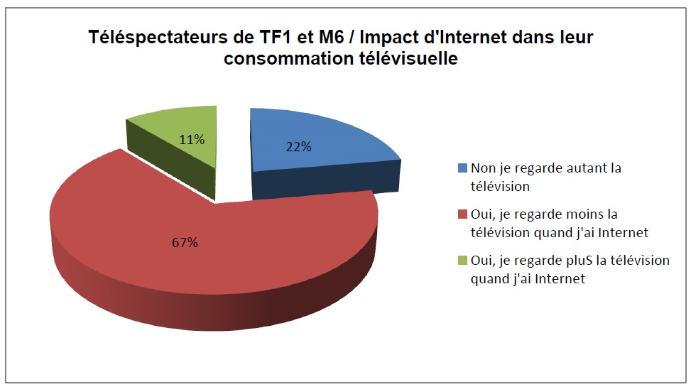 Ces résultats sont moins alarmistes en les pondérant avec les réponses de tous les téléspectateurs interrogés (sans distinction des chaînes regardées). Ce dernier ratio montre en effet que 71% de l’échantillon total diminue sa consommation de télévision quand il dispose d’une connexion Internet.