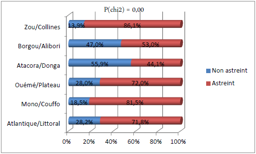 Le test de khi deux montre que la liaison entre le département et l’astreinte aux travaux dangereux est intense au seuil de 1%. Au moins six enfants sur sept des départements du zou et des collines effectuent des travaux dangereux. En effet, c’est dans ces départements que le travail des enfants aurait plus d’ampleur (rapport ENTE 2008) ce qui les prédisposerait aux travaux dangereux. C’est l’Atacora/Donga qui regorge le moins d’enfants exerçant les travaux dangereux avec une proportion de 44,1%.