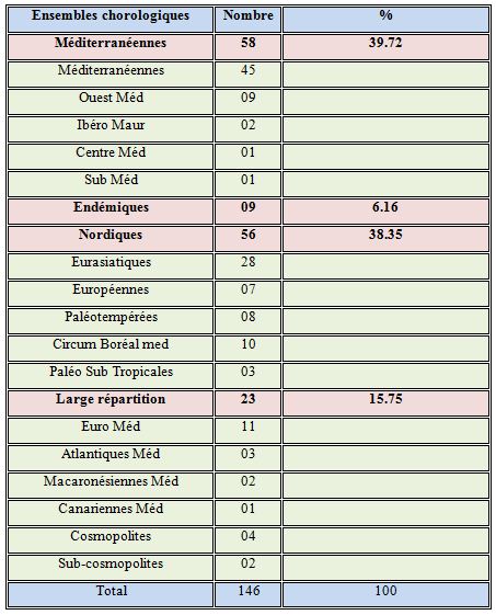 D’après les résultats présentés dans le tableau 5.2, on remarque que l’élément Méditerranéen domine avec un taux de 39.72 %, suivi par l’élément Nordique avec 38.35 % et les espèces de large répartition présentent un taux de 15.75%. Tandis que l’endémisme est présenté par un taux de 6.16 %.