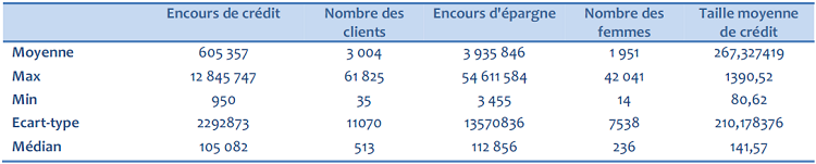 L’encours moyen de crédit en 2011 a été de 605357 USD. Du reste, le niveau de dispersion très élevé démontre qu’il y eu des écarts très significatives parmi les institutions sous études.