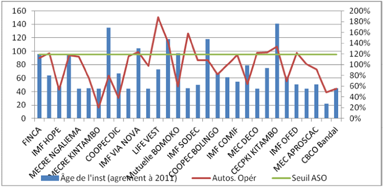 Bien qu’il existe quelques cas exceptionnels, de manière globale les institutions autosuffisante sur le plan opérationnelle sont ceux ayant déjà un certain âge. Une analyse minutieuse du graphique nous permet d’estimer cet âge à quatre soit 48 mois d’existence.