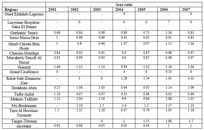 La répartition du sexe ratio selon les régions et l’année est représentée par le tableau XXVI.