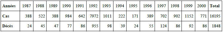 Le bilan des maladies à potentiel épidémique fourni par la Délégation régionale de la Santé Publique de l’Extrême Nord et se rapportant aux dix dernières années de 1990 à 2000 se présente ainsi qu’il suit :