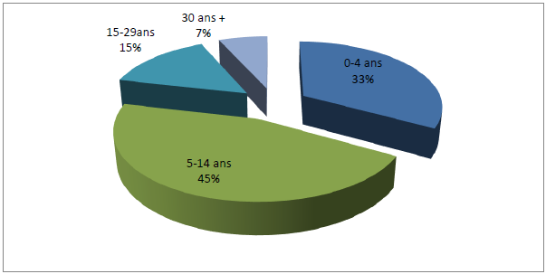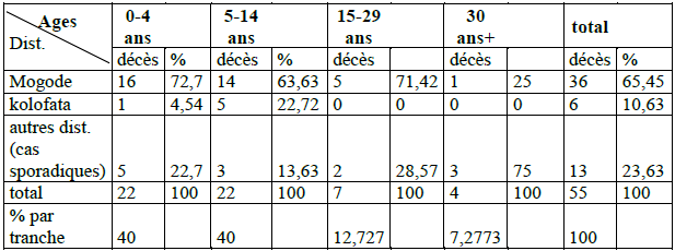 On remarque que les cas de méningite ne sont pas uniformément repartis selon l’espace et selon les tranches d’âge. La tranche d’âge de 0 à 15 ans est la plus touchée par les cas et décès.