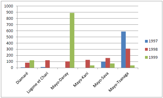Le tableau 8 ci-après présente la situation de l’épidémie entre le 30 Novembre 1996 et le 17 mai 1999. Deux grandes zones sont touchées. Il s’agit de Makari dans le Logone et Chari et les zones de montagne (Meri, Kolofata, Mogode, Bourha, Mokolo).