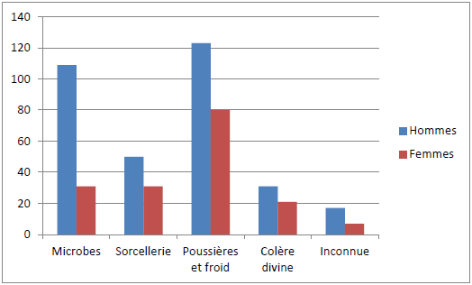 Ensuite viennent ceux qui croient que ce sont les microbes d’une manière générale, qui sont à l’origine de la méningite (33% chez les hommes et 18% chez les femmes) avec 28%. Toutefois, à coté des premiers, on note la présence de ceux qui attribuent la maladie à la sorcellerie (16%) et à la colère divine (16%). Plus faible est l’effectif des indécis ou plutôt ceux qui ignorent les causes de la méningite.