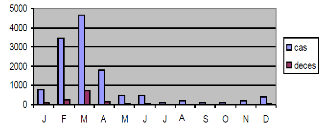 On remarque (figure 10) que nombres de cas et décès sont observés chaque année, avec cependant une intensité variable. En nous servant de ce tableau, nous avons obtenu le graphique ci-dessous.