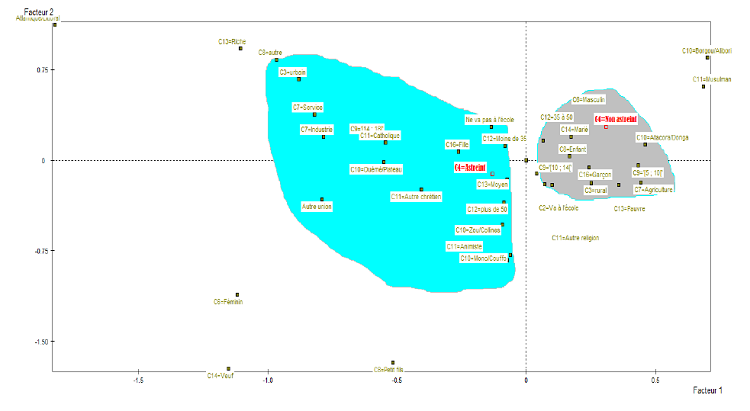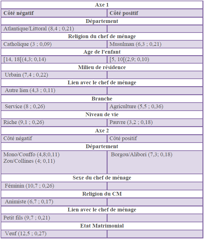 Ces résultats de l’AFCM ont confirmé d’une part la première hypothèse selon laquelle les enfants astreints aux travaux dangereux ne vont pas à l’école, ne sont pas les enfants biologiques des chefs de ménages et ces derniers sont non mariés. D’autre part, ces résultats confirment ceux de l’analyse bivariée. Le fait que ces enfants vivent dans des ménages riches s’expliquerait par le lien de parenté car les enfants sont pour la plupart non biologiques du chef de ménage.