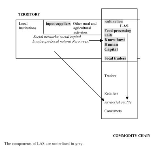 L’APL (ou Syal) peut être placé au point nodal de l’orthogonalité filière et territoire, en ce sens qu’il est articulé entre le territoire local (intégration horizontal des acteurs) et la filière (intégration verticale des acteurs) qui va au-delà du champ local (exportations) (Boucher & Requier Desjardins 2002).