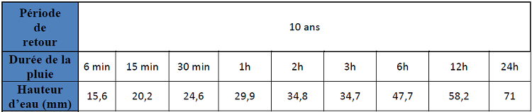 Le tableau suivant récapitule les valeurs des pluviométries moyennes en fonction de leur durée et pour une période de retour de 10 ans.