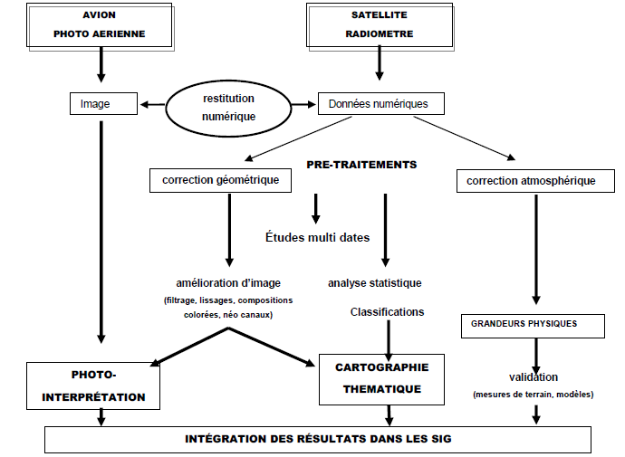 Jusqu’à ces dernières années, les méthodes de travail héritées de la photographie aérienne (photo-interprétation) sont restées largement dominantes pour les applications en télédétection: la photo-interprétation vise à effectuer sur les restitutions photographiques un zonage fondé sur la reconnaissance de zones homogènes par leurs teintes et leurs textures, et à la reconnaissance des grandes structures de l’image. La méthode reste tributaire des procédés de restitution utilisés qui ne sont pas contrôlés par l’interprète, et une part importante de l’information contenue dans les données numériques est ainsi perdue. La diffusion des ordinateurs et l’augmentation continue de leur puissance met aujourd’hui à la portée d’un nombre croissant d’utilisateurs la possibilité de recourir aux méthodes du traitement numérique des données. Le principal obstacle réside dans la nécessité de disposer, outre d’un ordinateur assez rapide, d’écrans couleur à haute définition, de périphériques de lecture et de stockage capables de gérer de gros volumes de données : une scène SPOT représente 27 à 40 Mo (méga-octets) d’information, une scène radar du satellite ERS-1 représente 130 Mo. Les méthodes de traitement numérique permettent d’utiliser au mieux des données de capteurs disposant de nombreux canaux. Les techniques de correction géométrique des images les rendent superposables à des cartes ou superposables entre elles, permettant des analyses multi-dates.