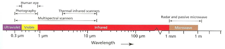 Une partie très limitée de ce spectre, entre 0,390 μm et 0,7 μm, constitue la lumière visible à laquelle est sensible l’oeil humain. Une décomposition en fonction des longueurs d’onde de la lumière visible (lumière blanche) aboutit à distinguer les lumières colorées : violet (0.4 – 0.446 μm), bleu (0.446 – 0.500 μm), vert (0.500 – 0.578 μm), jaune (0.578 – 0.592 μm), orange (0.592 – 0.620 μm) et rouge (0.620 – 0.7 μm). Les longueurs d’onde inférieures à 390 nm (ou les fréquences supérieures à celle du violet) ne sont pas perçues par l’oeil humain ; il s’agit du rayonnement ultra-violet. De même, les longueurs d’onde supérieures à 0.7 μm, également non-perçues par l’oeil humain, constituent le domaine de l’infrarouge (Proche infrarouge 0.7 -1, 5 μm et infrarouge thermique 8,5 -12,5 μm) et enfin le domaine des micro-ondes (microwave) : 1 mm-1m.