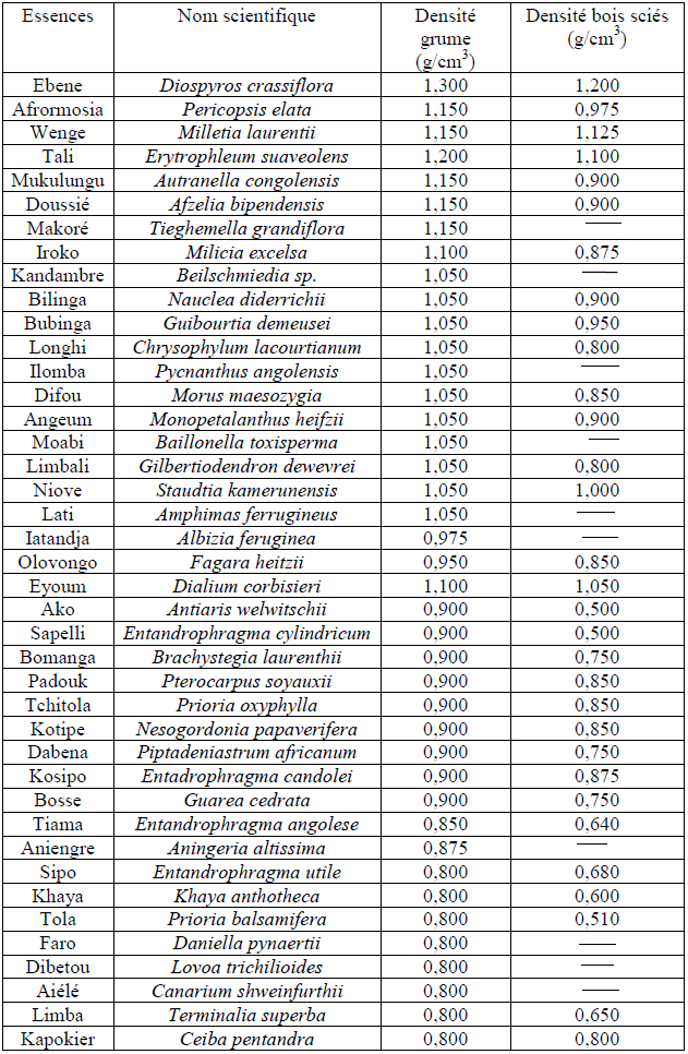 Nous présentons dans le prochain tableau la densité des différentes essences en grumes et produits sciés.