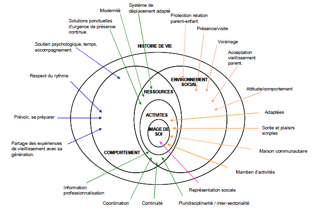 Il s’agit, grâce à ce que l’on fait ou dit, de se sentir encore participer à sa propre vie (autonomie) et au monde qui entoure (se sentir utile). Ces deux perceptions positives de soi à l’âge avancé sont au centre du schéma car elles sont éminemment « sensibles » aux autres facteurs.